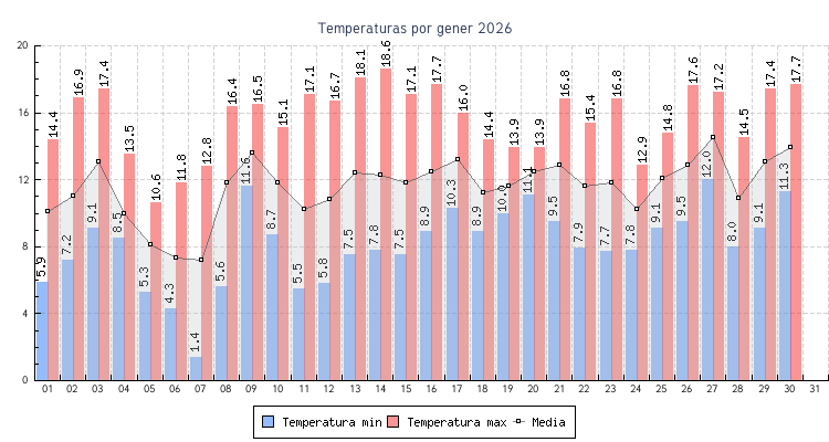 | 01 | 5.9 °C | 14.4 °C | 10.1 °C | 5.4 km/h (17.7 km/h) | O |