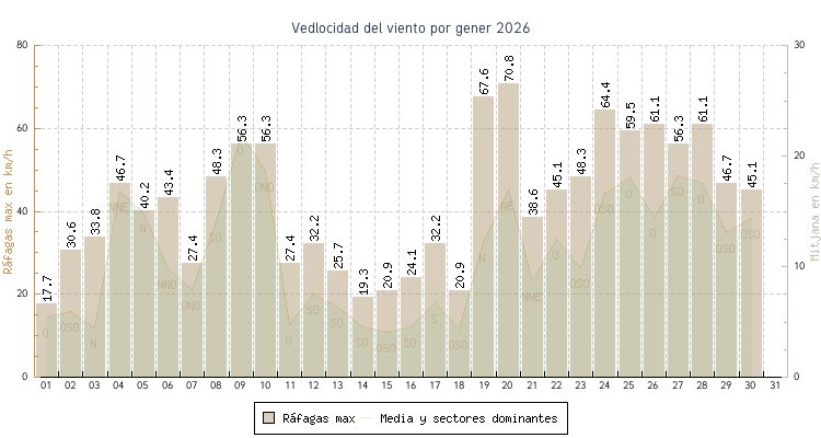 | min | max | mitjana | Velocitat (rafages) | Sector | ||